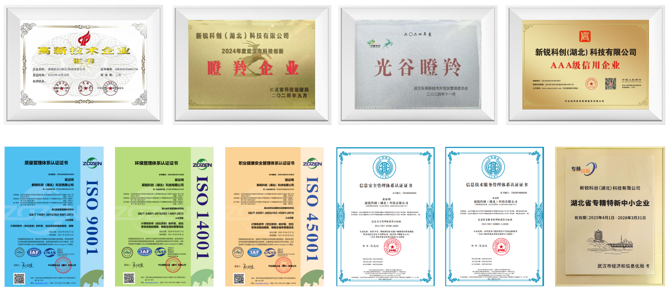 新銳科創(chuàng)獲得了20+項企業(yè)認證,包括:高新技術企業(yè)、AAA信用企業(yè)認證、武漢科技創(chuàng)新瞪羚企業(yè)、光谷瞪羚企業(yè)、湖北省專精特新中小企業(yè)、ISO五項體系認證、江蘇省通信學會科學技術獎等。
