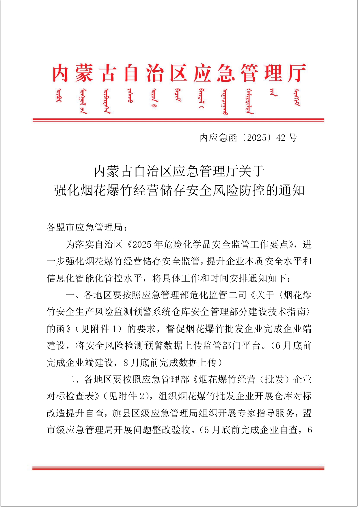 根據《內蒙古自治區應急管理廳關于強化煙花爆竹經營儲存安全風險防控的通知》,企業需重點落實以下任務: