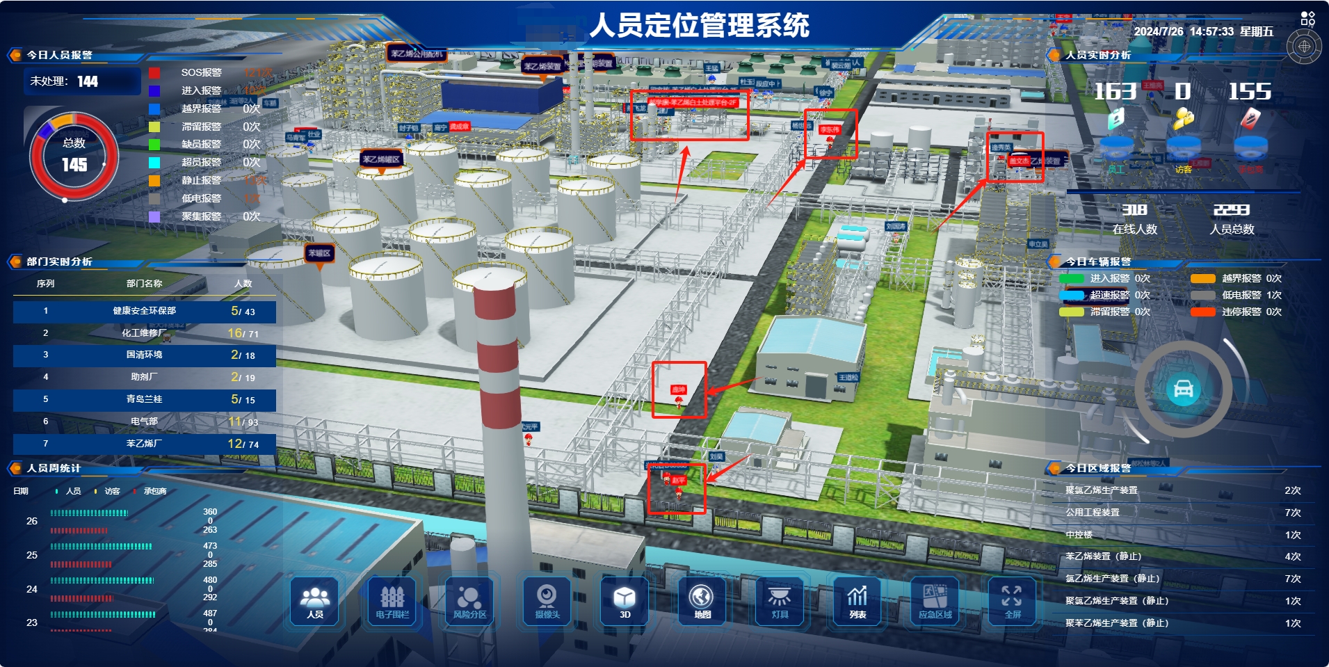 通過UWB、藍牙等定位技術,實現對庫區作業人員的實時定位,精度可達亞米級。系統可實時捕捉人員位置信息,無論人員身處庫區的任何角落,其位置都能在管理后臺清晰呈現。
